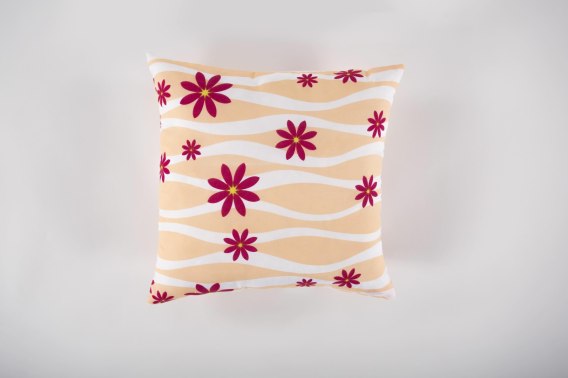Poduszka dekoracyjna 40x40 beżowa w białe fale i czerwone kwiatki - Simply
